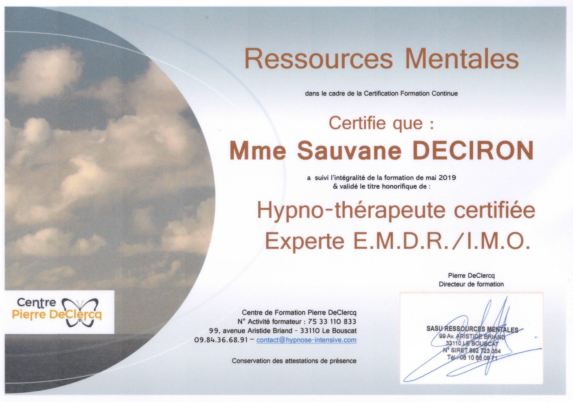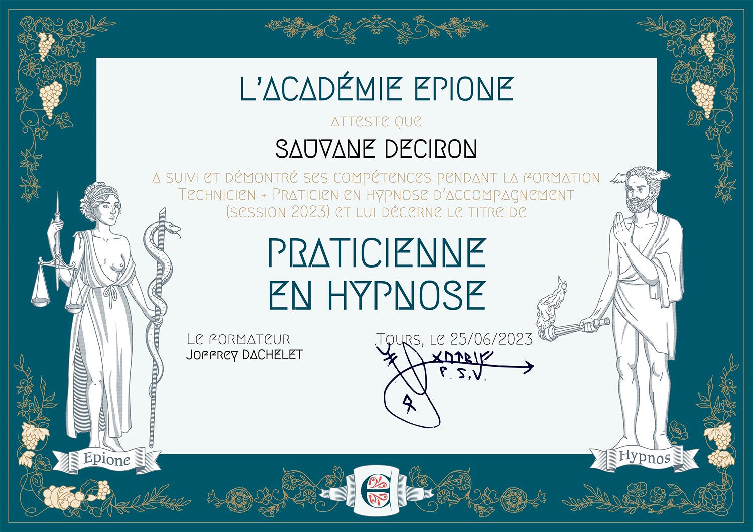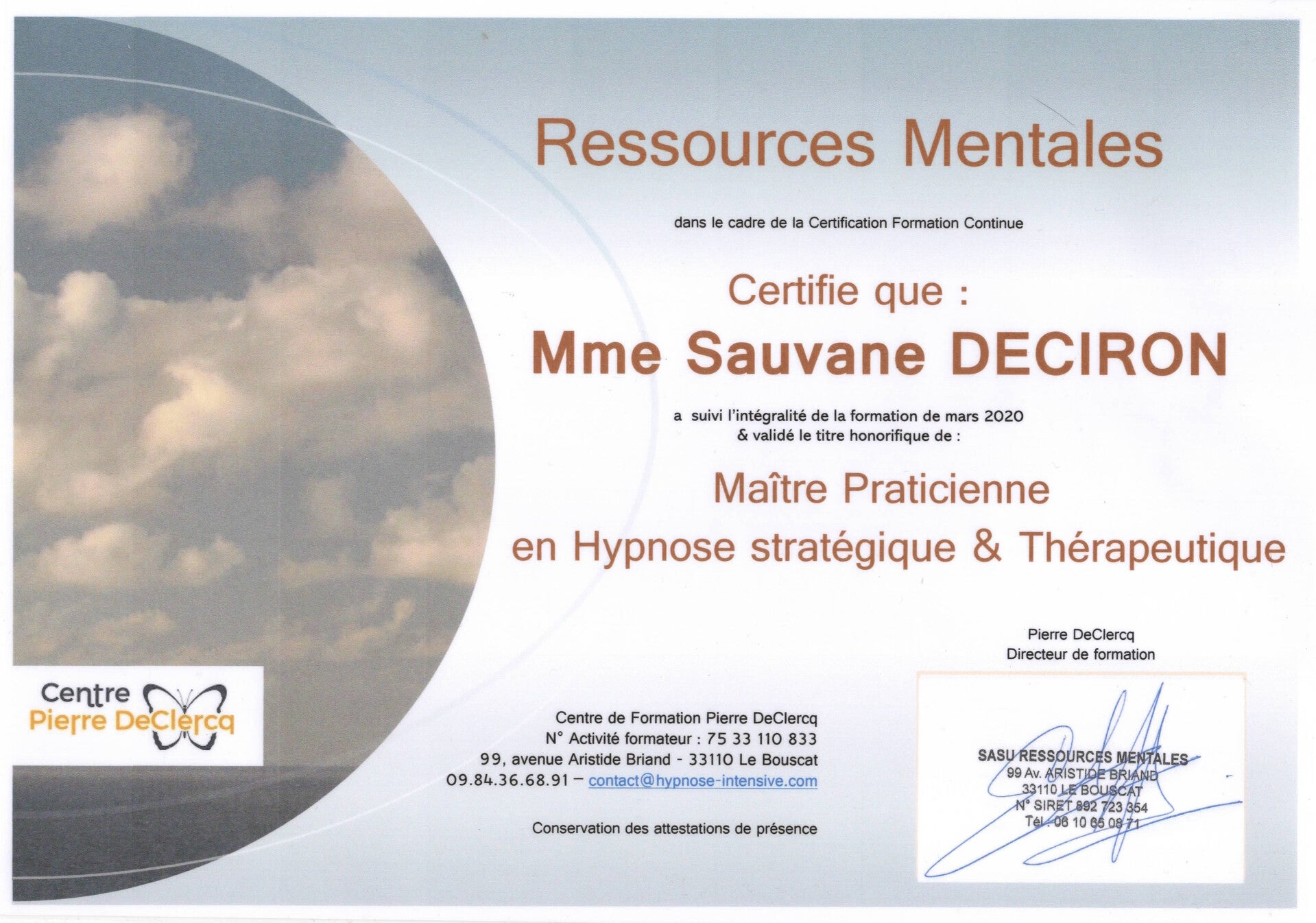 Je suis Hypnothérapeute certifiée Maitre praticienne et formatrice.
